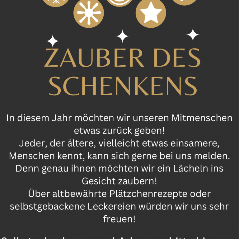 Wir haben unsere Aktion „Zauber des Schenkens“ in diesem Jahr neu aufgelegt. In diesem Jahr suchen wir zum Einen fleißige Bäcker die uns unterstützen unsere Aktion umzusetzen und zum Anderen suchen wir nach Adressen, von Menschen denen wir etwas Gutes zukommen lassen können. Wir möchten mit unseren Kindern Plätzchentüten und Weihnachtskarten verteilen und somit Menschen,…
